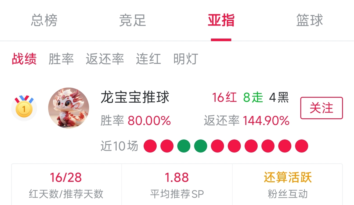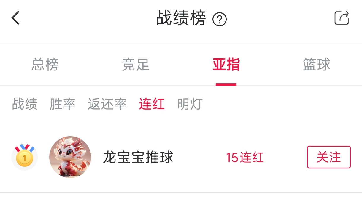 15连红🎯亚指双榜一,这状态真不赖恭喜社区大神“龙宝宝推球 ”15连红,战绩榜排名第一!