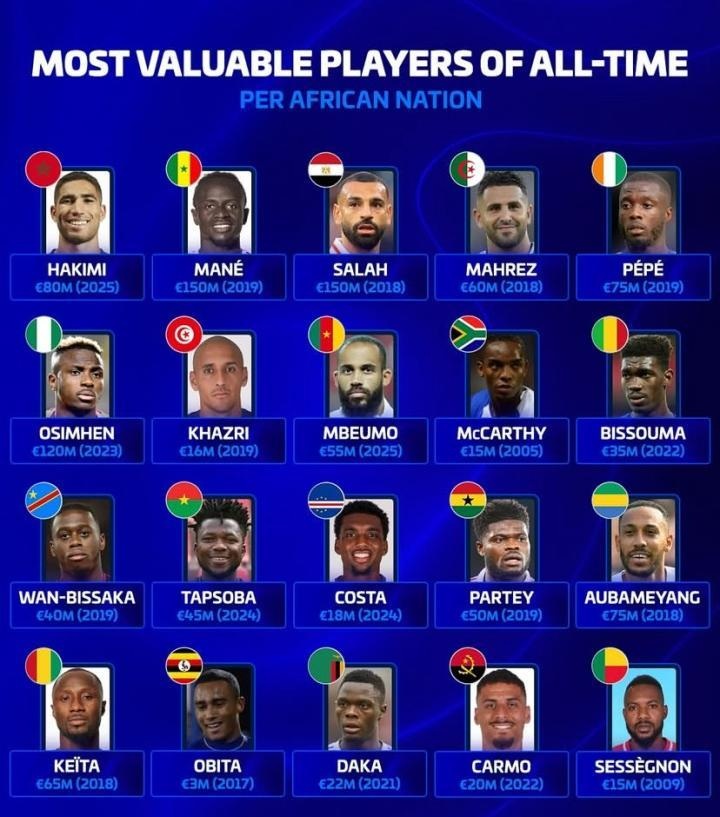 近日,德转盘点了非洲各国球员历史最高身价,每个国家选择身价最高者统计,其中昔日利物浦双子星萨拉赫、马内巅峰身价均达到1.5亿欧元,奥斯梅恩2023年身价达到1.2亿欧元峰值,三人也是仅有的三位非洲亿元先生。