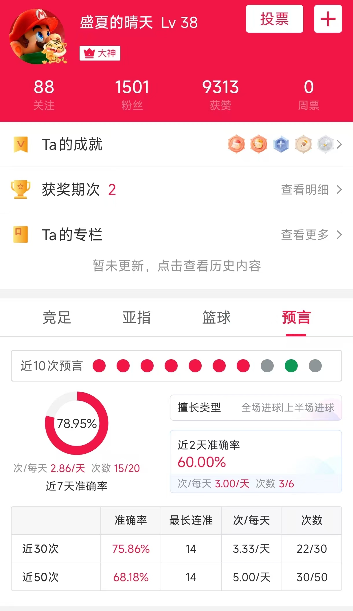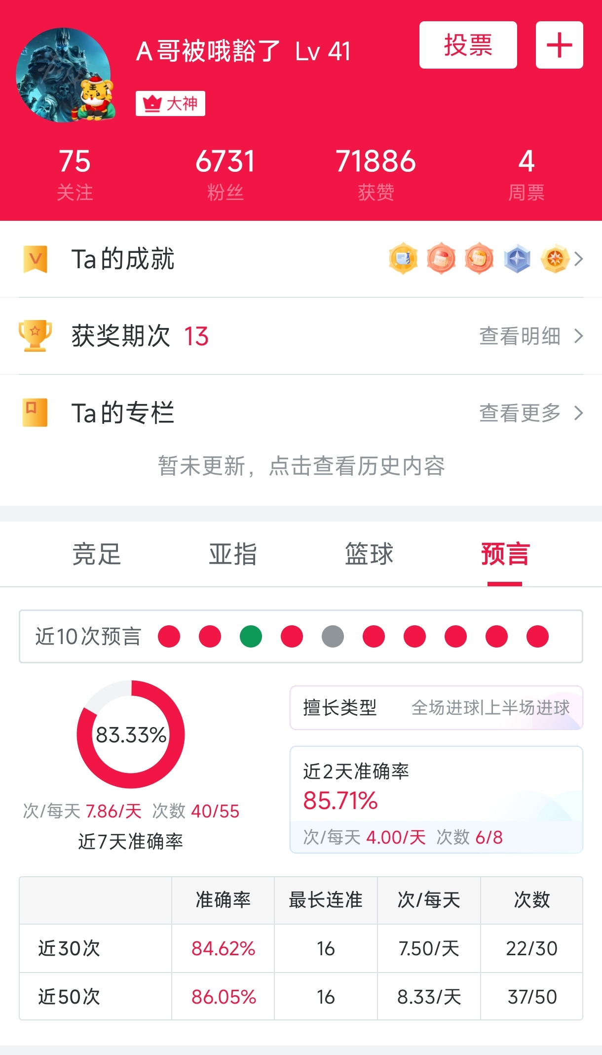 昨晚3位大神:小A小鸽鸽 、A哥被哦豁了 、盛夏的晴天 连中确实全军覆没了,但随后有两人迅速调整了状态,总体15中10,也算可观,另外让我们看看今晚盛夏的晴天 能不能反弹。