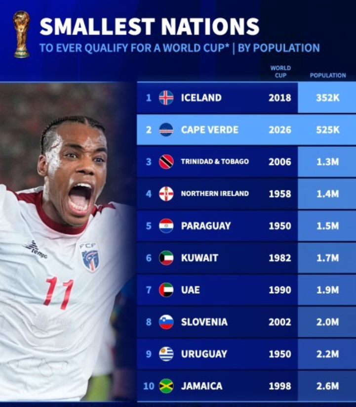 世预赛非洲区中,岛国佛得角主场3-0大胜斯威士兰,锁定小组头名,队史首次晋级世界杯正赛,这个人口只有52.5万的小国成为二战后首次晋级世界杯时人口第二少的国家,仅多于2018年的冰岛,冰岛当时人口仅35.2万。