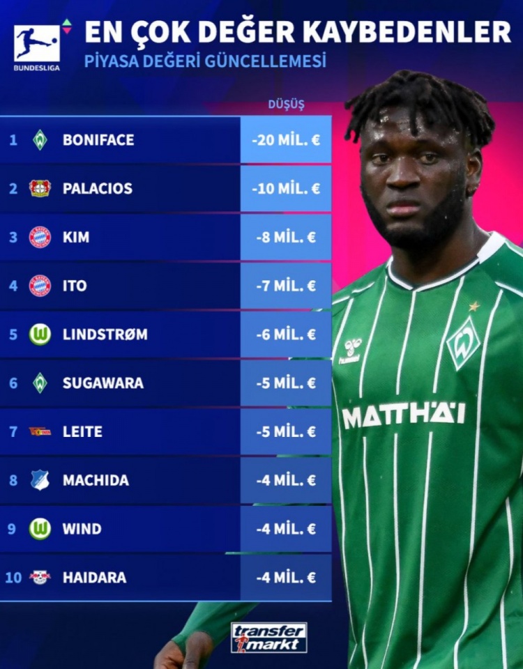 📉德甲球员身价下跌榜:博尼费斯缩水2000万,金玟哉第三