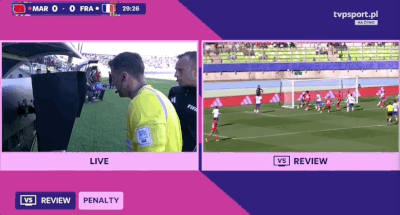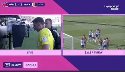 第74分钟,法国球员禁区内疑似手球,主裁判观看var后没有吹罚点球!
