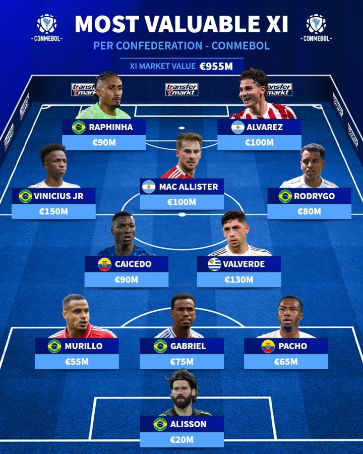 💶南美足联最贵阵容:维尼修斯领衔,巴尔韦德位居其后