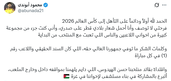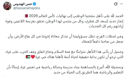 卡塔尔队长哈桑-海多斯表示:我们国家队晋级了2026年世界杯,这是一项成就,让每个卡塔尔人都感到高兴。