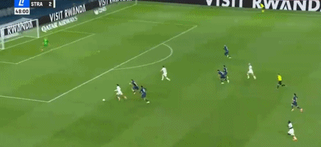 第42分钟,杜埃后场传球被抢断,巴伦廷·巴尔科巧妙挑传,迭戈·莫雷拉迎球低射打进左下角,斯特拉斯堡2-1反超!!