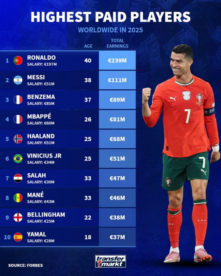 2025年球员收入榜:C罗2.39亿欧元断层第一,超梅西2倍