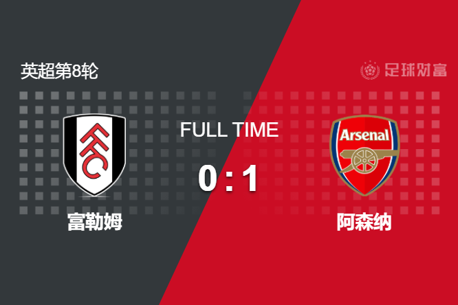 最终全场比赛结束,阿森纳客场1-0击败富勒姆,继续排名英超榜首。
