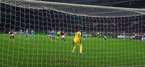 第17分钟,德布劳内主罚禁区弧顶外任意球,右脚兜射被门将化解!