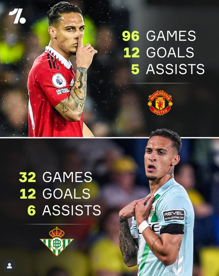 据统计,安东尼代表贝蒂斯出场32次,各项赛事贡献12球6助攻,直接参与18球,他在曼联效力3年,总出场96次贡献12球助攻5次,直接参与17球。