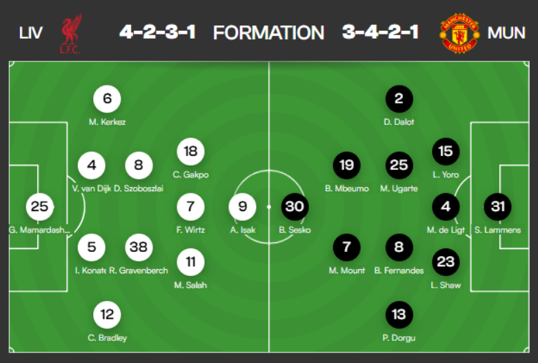 曼联方面,德里赫特领衔三中卫阵容,达洛特和多尔古踢边翼位,B费坐镇中场,塞斯科单箭头。
