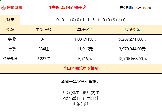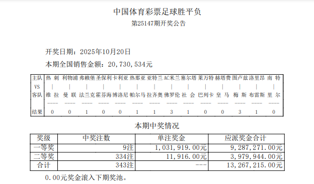 胜负彩25147期开奖:冷门迭爆主队输麻了!头奖9注103万