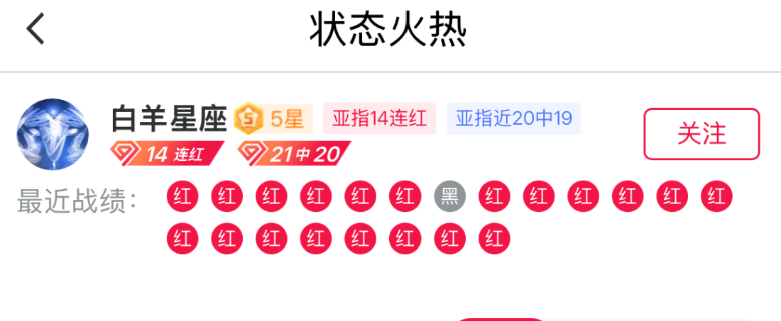 白羊星座昨天延续好状态,这波14连红操作属实亮眼,白羊星座 目前近20中19,近7天胜率100%,返还率168.80%。看这架势,状态还热着,咱们继续围观,看他的火力能持续多久🔥