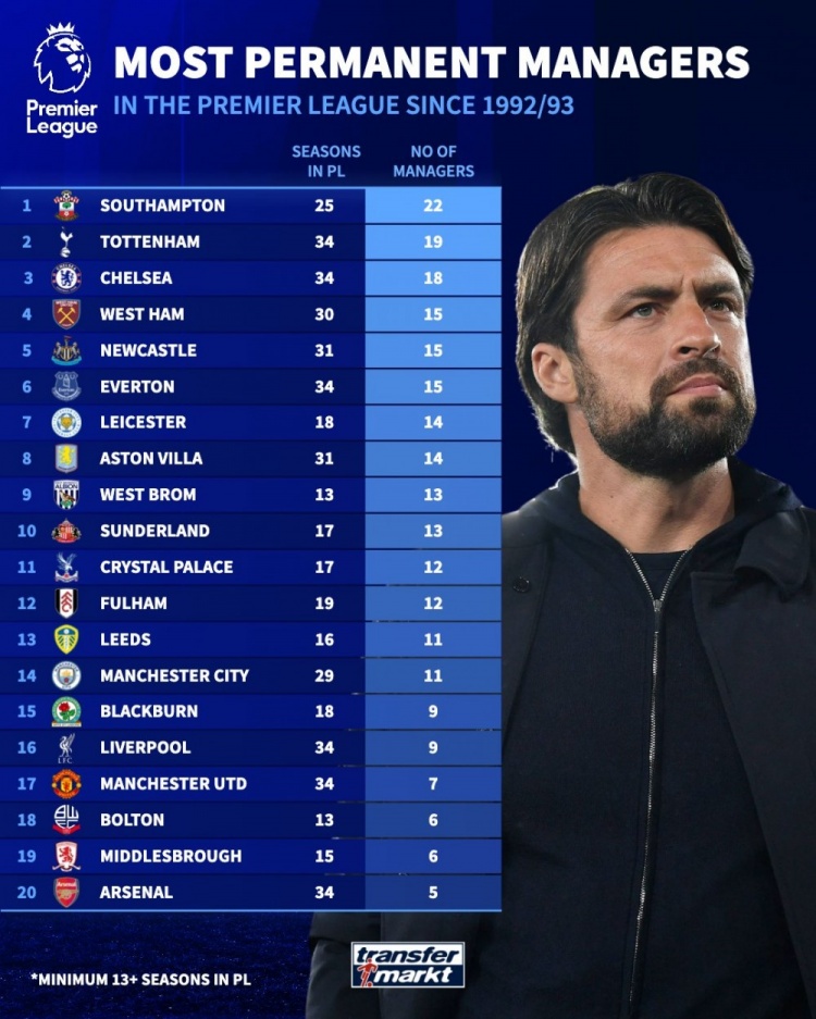 近日,德国转会市场统计出了英超联赛历史中,各支球队更换主教练次数排名,其中南安普顿25个英超赛季更换22名主帅最多,排在2-4位的是热刺、切尔西、西汉姆三支伦敦球队,相反换帅最少的是阿森纳,枪手34个英超赛季只有5名主帅带队。