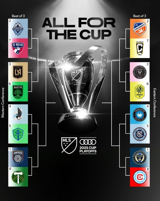 美职联季后赛对阵也相继出炉,迈阿密国际将对阵纳什维尔,洛杉矶FC对阵奥斯汀。