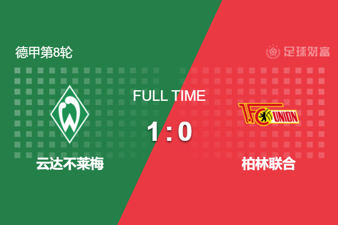 最终全场比赛结束,不莱梅主场1-0击败柏林联合。