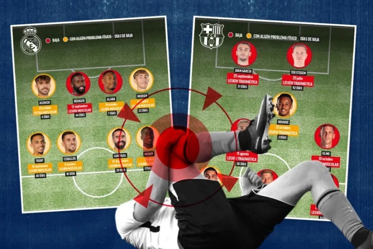 北京时间10月26日晚23:15,西甲第10轮即将迎来焦点战,皇马主场迎战巴塞罗那。赛前,据西媒《马卡报》统计,双方共有16名球员有伤在身,其中8人无法出战本场焦点战。