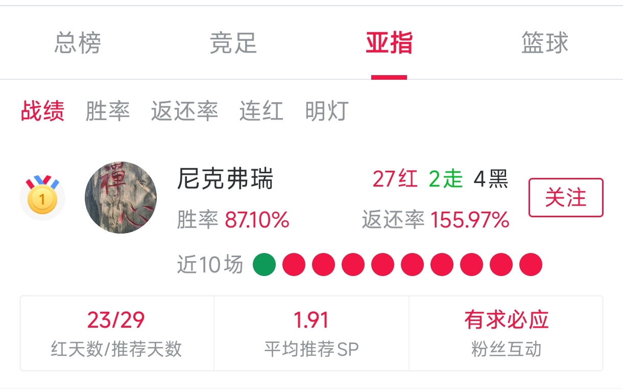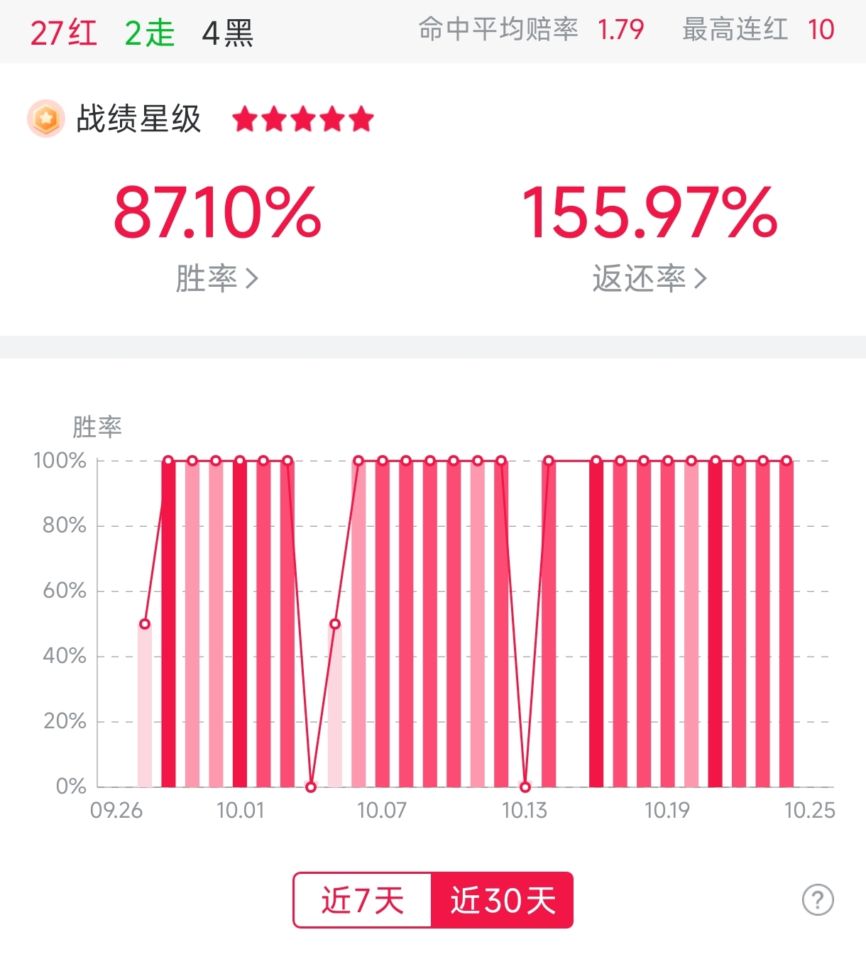 近7天胜率100%,返还率184.58%。近30天胜率87.1%,返还率155.97%,可以说是相当可观。