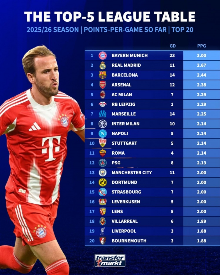 五大联赛场均积分:拜仁7战7捷排名首位,皇马第二