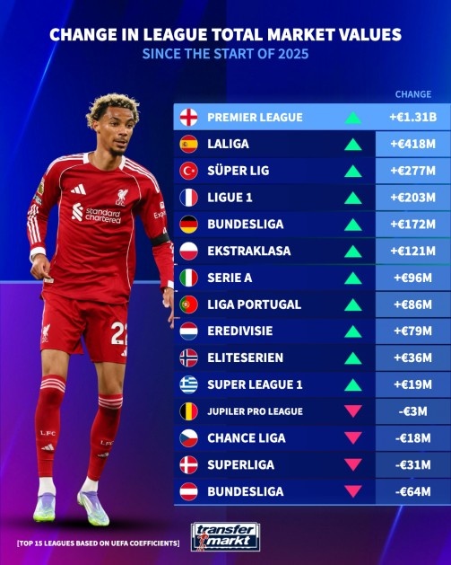 💹欧洲联赛身价浮动:英超暴涨13.1亿欧,土超上涨2.77亿欧