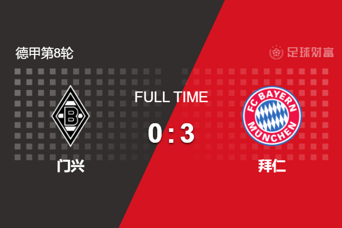 最终全场比赛结束,拜仁客场3-0击败门兴,继续保持赛季全胜!