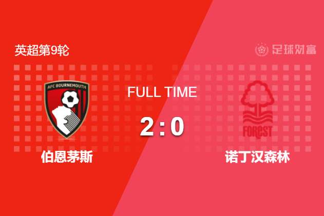 最终全场比赛结束,伯恩茅斯主场2-0击败诺丁汉森林,升至积分榜次席。