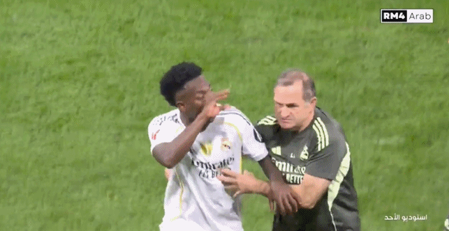 维尼修斯此后加入对喷,向亚马尔做出“闭嘴”的手势,双方球员围成一团冲突加剧。