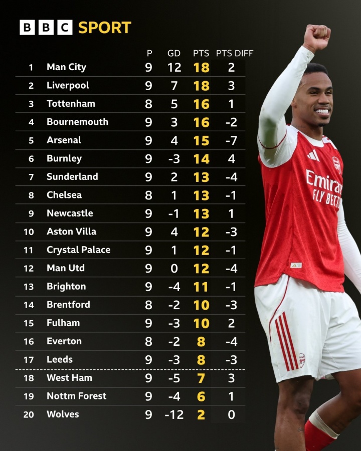 BBC统计仅计算运动战进球英超积分榜:阿森纳将降至第5