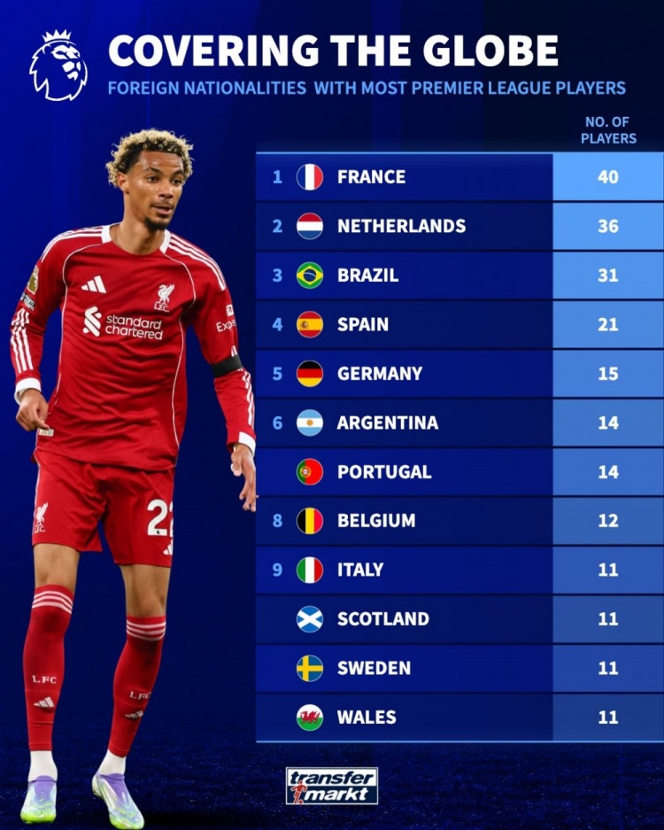 德转列英超联赛外援国籍统计:法国居首,荷兰位居次席