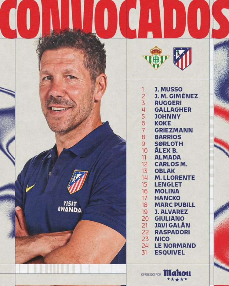 马竞客战贝蒂斯大名单:阿尔瓦雷斯领衔,卡尔多索回归