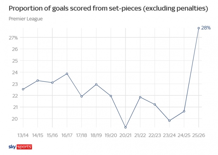 不仅如此,英超联赛过往赛季定位球破门比例在20%至23%之间,而本赛季前9轮战罢后,定位球破门比例高达28%,已经远高于此前的赛季。