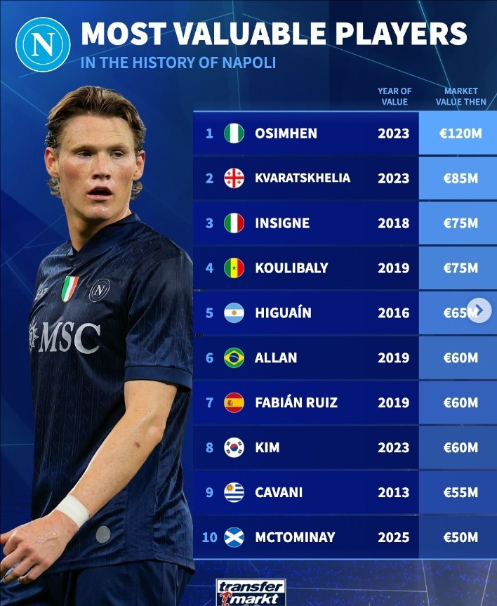 德国转会市场统计了那不勒斯队史的身价前10球员,2023年的奥斯梅恩位列第一,同赛季的克瓦拉茨赫利亚以8500万欧排名第二。
