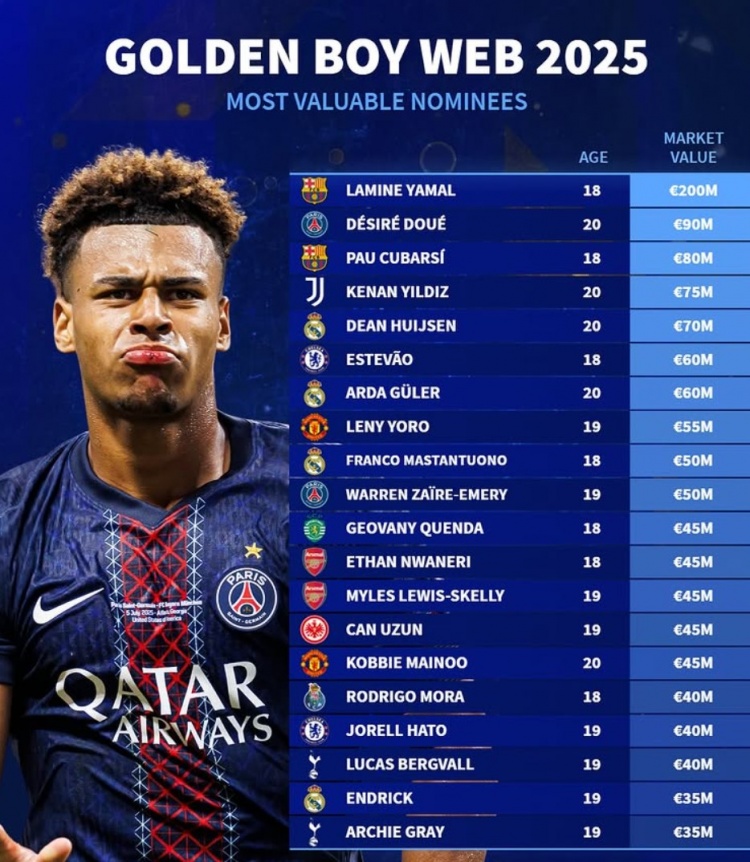 💸金童奖候选人身价榜:亚马尔2亿居首,杜埃、怀森入选