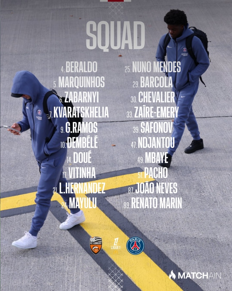 大巴黎公布vs洛里昂大名单:法比安·鲁伊斯、李刚仁缺席