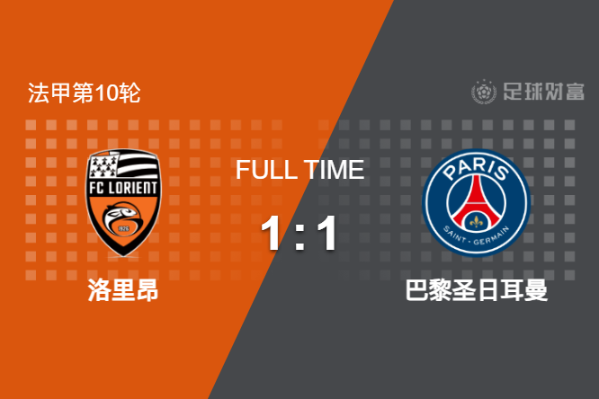 最终全场比赛结束,洛里昂主场1-1逼平巴黎。
