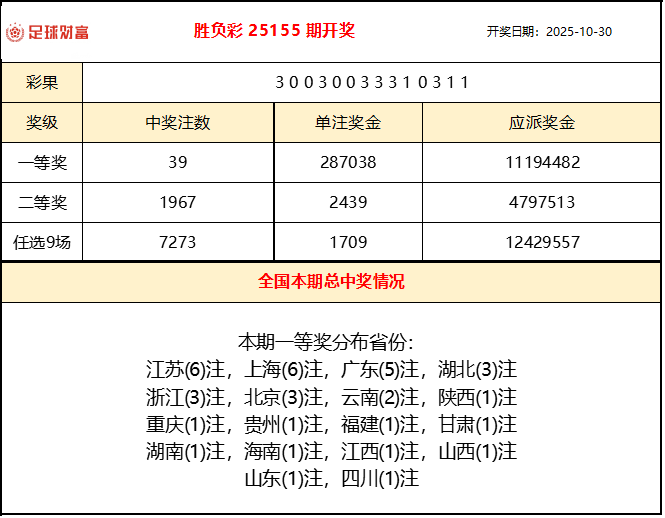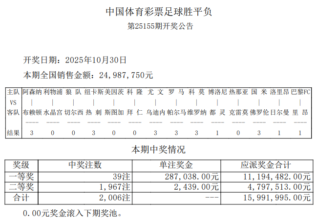 胜负彩25155期开奖:利物浦0-3完败,头奖39注28.7万
