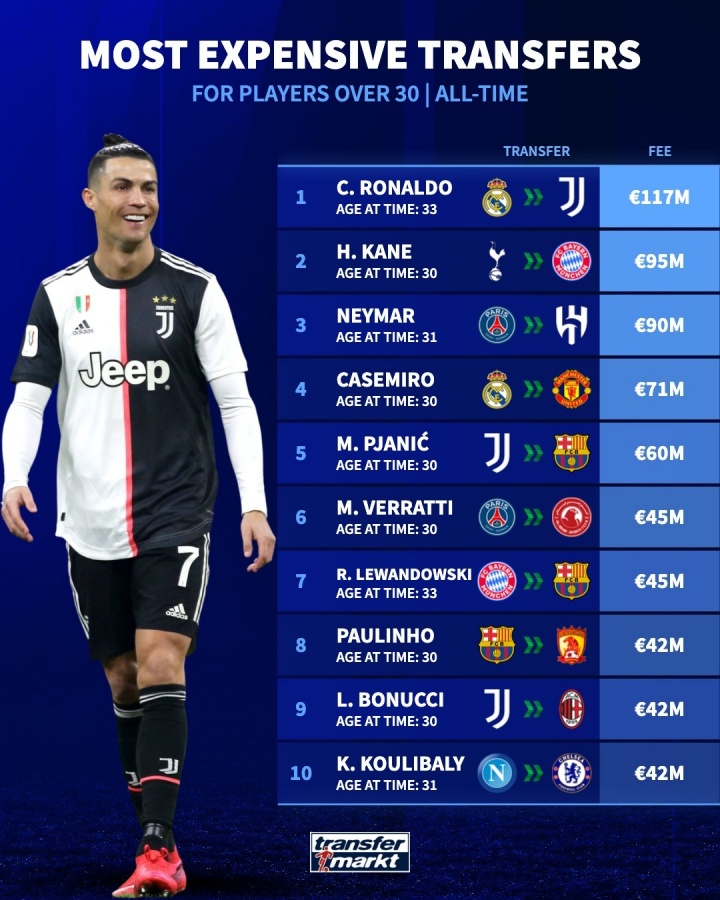 30岁以上球星转会费排名:33岁C罗居首,拜仁凯恩在列