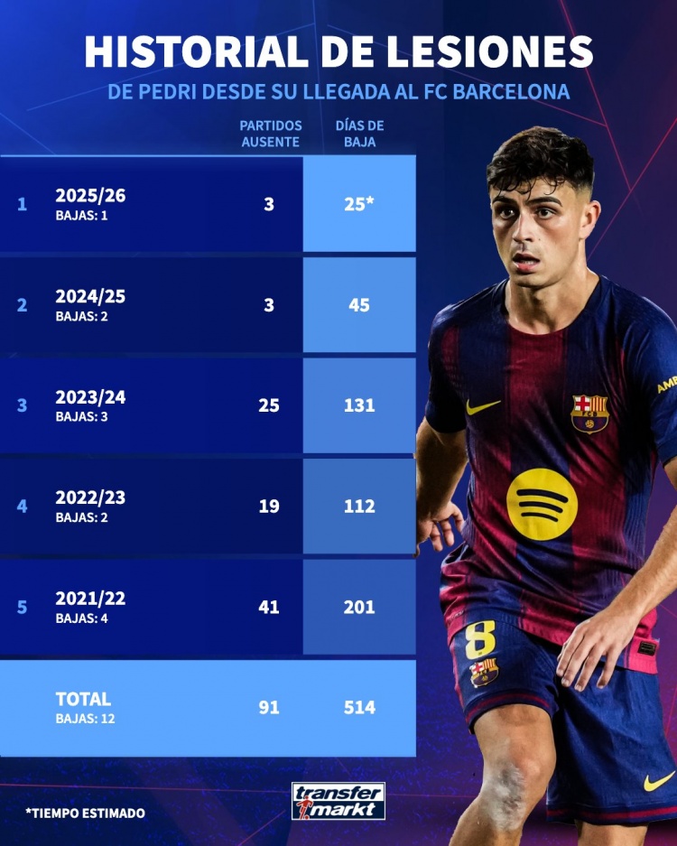 🤕伤病不断!佩德里近5个赛季12次受伤,缺席514天91场