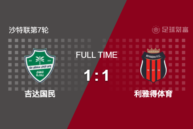 最终全场比赛结束,吉达国民主场1-1战平利雅得体育。
