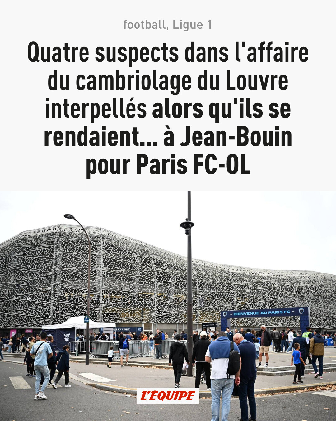 报道称,巴黎FC的让-布安体育场附近,警方逮捕了4名嫌疑人,他们涉嫌近期发生的卢浮宫盗窃案件,另外一名嫌疑人则是在拉古尔纳夫被捕。