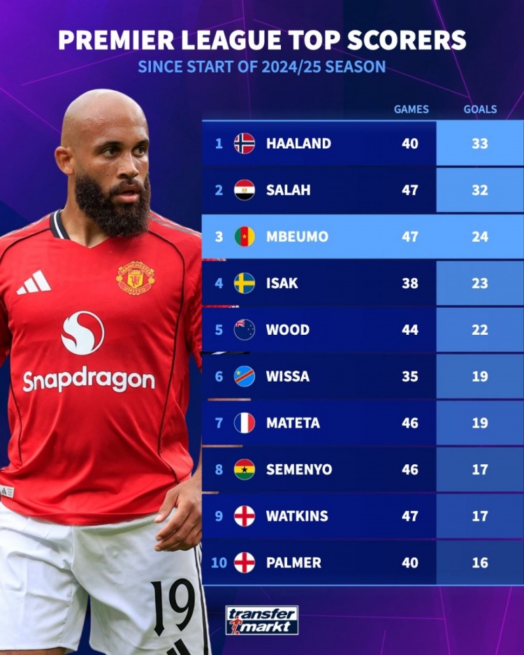 近日,德转统计了上赛季至今英超联赛总射手榜,哈兰德打进33球领跑,萨拉赫32球排名第二,本赛季加盟曼联的姆贝乌莫打进24球排名第三。伊萨克本赛季加盟利物浦,英超赛场还没有破门,凭借上赛季的23球排名第4位,本赛季已经打进6球的伯恩茅斯边锋塞梅尼奥上榜。