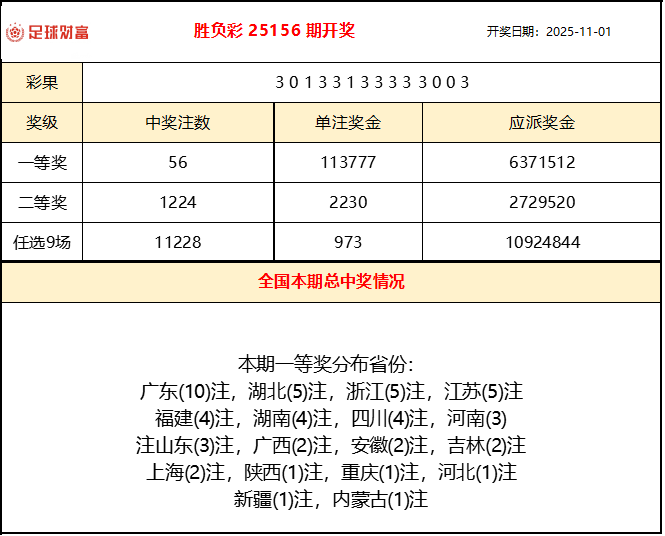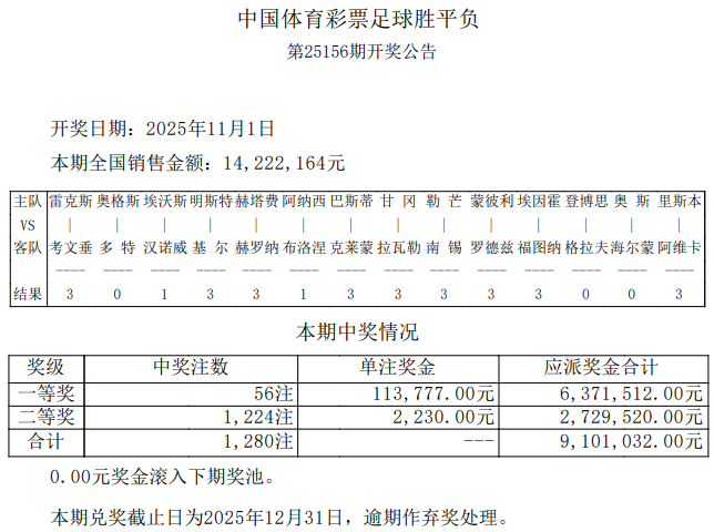 胜负彩25156期开奖:考文垂客场失利,头奖11.3万元