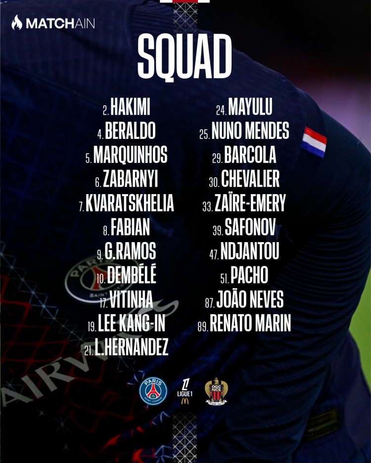 巴黎对尼斯大名单:阿什拉夫、李刚仁复出,杜埃缺席