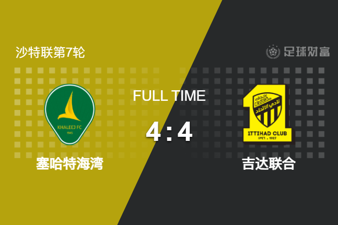 最终全场比赛结束,十人吉达联合客场4-4战平塞哈特海湾。