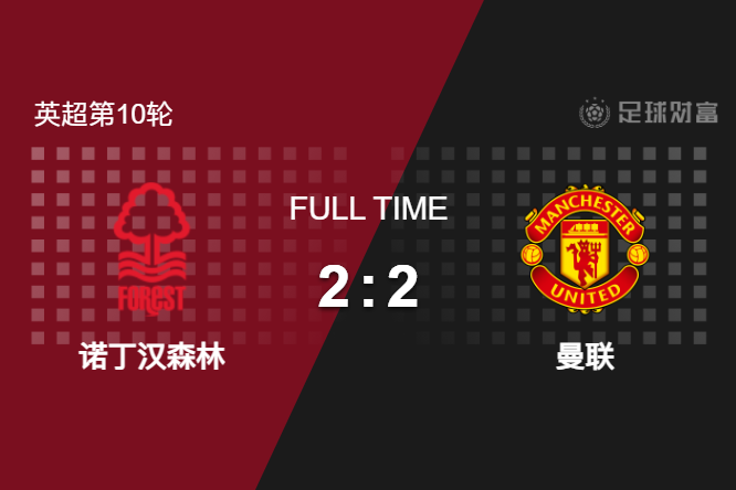 最终全场比赛结束,诺丁汉森林主场2-2战平曼联。