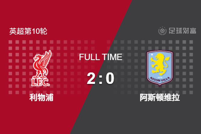最终全场比赛结束,利物浦主场2-0战胜维拉。