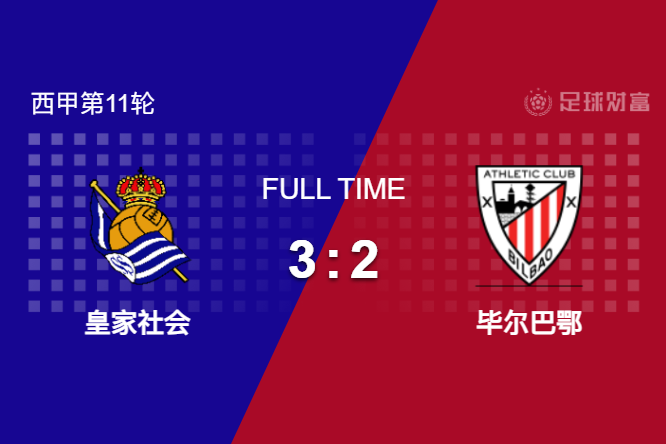 最终全场比赛结束,皇家社会主场3-2战胜毕尔巴鄂竞技。