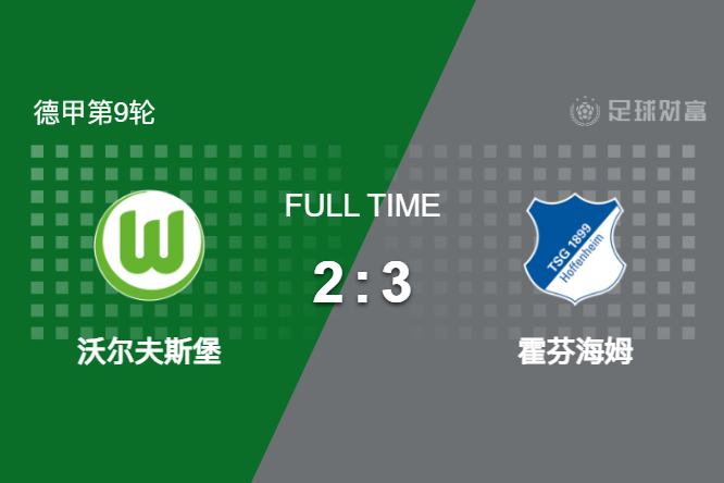 最终全场比赛结束,沃尔夫斯堡主场2-3不敌霍芬海姆。