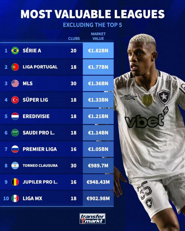 德转统计了除五大联赛之外,最有价值联赛的榜单,其中巴甲以18.2亿欧元的市场价值排名第1,葡超联赛以17.7亿欧元排名第二。