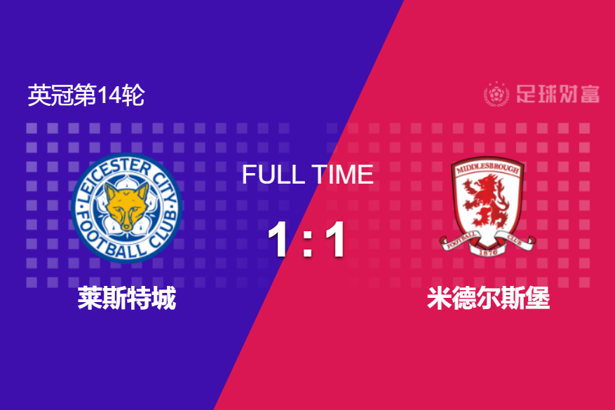 最终全场比赛结束,莱斯特城1-1战平米德尔斯堡。
