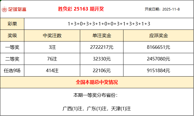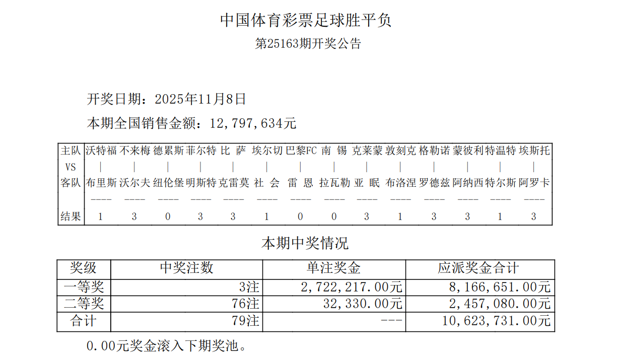 胜负彩25163期开奖:不莱梅终场绝杀!头奖3注272万
